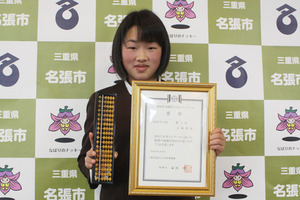 前年度のコンテストでは1位と僅差の2位で、悔しい思いをしたこともあり、小林さんは「1位を取れるか不安だったのでうれしい。教室での練習を頑張ってきてよかった」と受賞を喜んだ。亀井市長は「次なる目標はそろばん10段。中学校に入っても1位を取り続けていってほしい」と応援した。