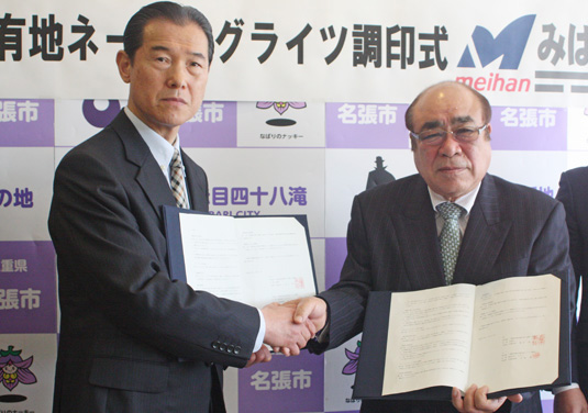 同社は同市夏見の市民野球場「メイハンスタジアム」も命名権を取得しており、今回の調印で3か所目。田畑社長は「名張にある企業として、市を応援したいと思った。皆が集う場所として利用してもらいたい」と思いを語った。