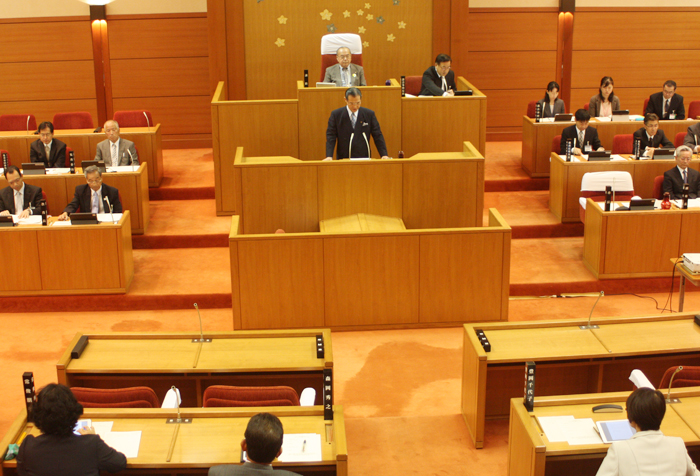 議員定数についての条例は議員定数を2人減の18人とするもので、喜働の川合滋議員が代表して説明。提案理由を「(全員協議会の中の意見でも)20人の定数は全国平均からしても多くはなく少ないくらいだが、住民の議会費負担額が多く、定数を18人とした場合の一人あたりの住民数も不可能な数ではないこと」などとした。