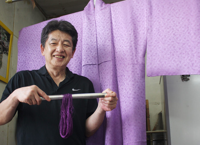 今回は、稲岡さんが提供した糸を使って作家が仕立てた着物を始め、帯や小物、コサージュ、アクセサリーなど十数点を展示予定。「海で獲れる巻貝を使った、こんな美しい染色が伊賀にあることを知ってほしい」と話している。
