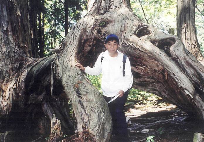 幼いころから父の山仕事を見て育ち、5年前から仲間と日本各地の大木・老木などを見に行くグループ「巨木ツアーの会」を始めた、名張市下比奈知の福永正美さん(65)。グループではこれまでに約30か所を訪れており、「まだまだ見たい巨木がある。会を長く続けていきたい」と、2か月に1回のペースで出掛けている。【赤沢自然休養林でヒノキの巨木に触れる福永さん(本人提供)】
