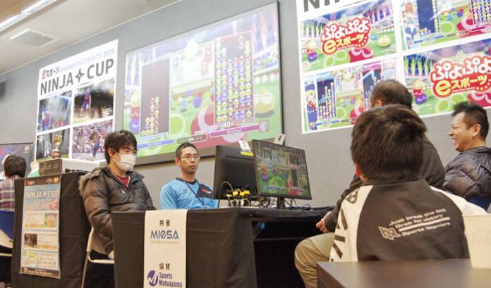 大会は「NINJA CUP」と名付けられ、昨年11月に続き2回目の開催。パズルゲーム「ぷよぷよ」とサッカーゲーム「ウイニングイレブン」の2種目があり、個人の勝ち抜き戦で競った。