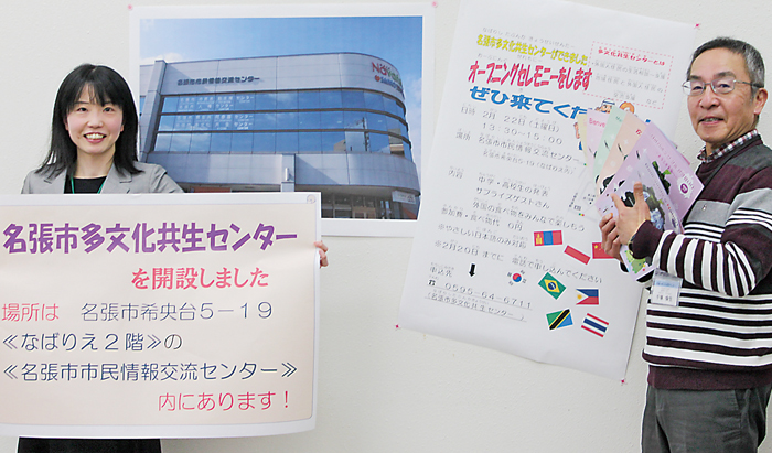 外国人住民の増加に対応しようと、名張市市民情報交流センター(同市希央台5番町)内に「名張市多文化共生センター」が開設された。本格始動は4月からだが、2月22日(土)午後1時半から同3時まで、オープニングセレモニーが開かれ、中学生や高校生の多文化共生に関する発表、外国の食文化交流などがある。【オープニングイベントをPRする手塚さん(右)と松崎さん=名張市希央台5で】