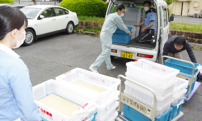 この日は職員らが公用車と郵便局の車両計6台に封筒が入ったプラスチックケース173個を積み込み、名張郵便局(栄町)まで運んだ。市の担当者は「大量の配送になるため、地域によって到着に差が出る可能性がある」と話している。
