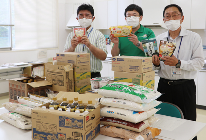 商品は毎月25日に両市社協に提供されることになっており、この日は、米や即席麺、レトルト食品、調味料などが渡された。