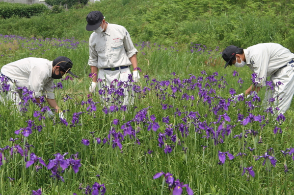 県指定天然記念物で伊賀市西之澤にあるノハナショウブ群落で6月9日、伊賀白鳳高校生物資源科の生徒が除草作業を行った=写真。花の見頃は13日ごろまでだという。