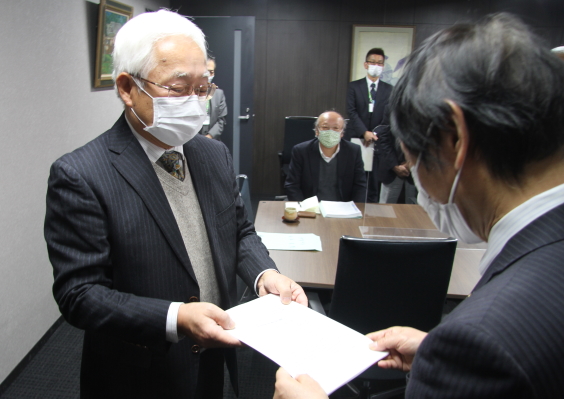 伊賀市が6か所の支所を廃止し、市域を北部と中部、南部に分けて2022年4月から「(仮称)地域振興センター」を設置する方針を示しているのを受け、条例に基づく住民自治組織「島ヶ原地域まちづくり協議会」が12月9日、支所廃止案の撤回を求める要望書を住民アンケートの結果とともに、岡本栄市長に手渡した。【岡本市長に要望書を手渡す松永会長(左)=伊賀市役所で】