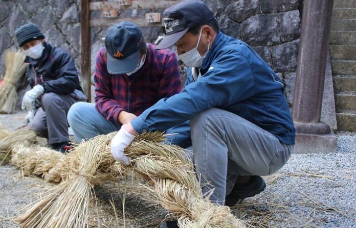 長老講の男性たちは、地元で育ったもち米の稲わらを15センチから20センチほどの太さに編んでいき、最後に端をわら切りで奇麗に切りそろえた。作業を見守った大井貞夫宮司(85)は「歴史ある山の神のしめ縄を今年も作ることができて良かった。この縄のように太く長く生きていけるような年になれば」と話していた。