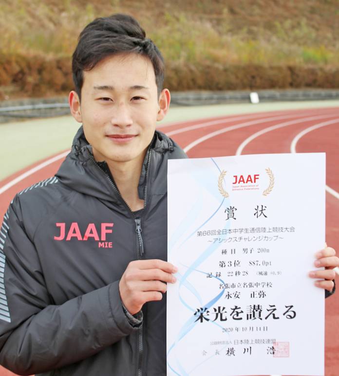 昨年、新型コロナウイルス感染拡大防止のため各都道府県単位での開催となった「全日本中学校通信陸上競技大会」の男子200メートルで、名張中3年の永安正弥君(15)(名張市鴻之台)が全国3位となる22秒28の自己新記録をマークした。大会の中止や延期が相次ぐ中、目標を見失うことなく記録を伸ばし続けている。【全国3位の賞状を手にする永安君=名張市で】
