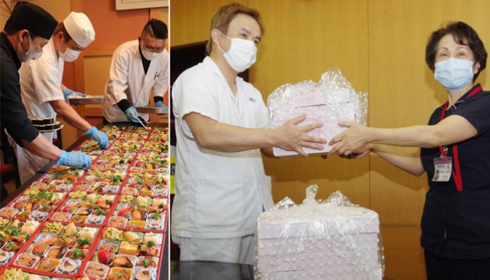 新型コロナウイルスの感染拡大が続く中、最前線で治療に当たる医療従事者を応援しようと、三重県料理業生活衛生同業組合上野支部が4月15日、伊賀市の上野総合市民病院(四十九町)と岡波総合病院(上野桑町)に特製弁当を無償提供した。