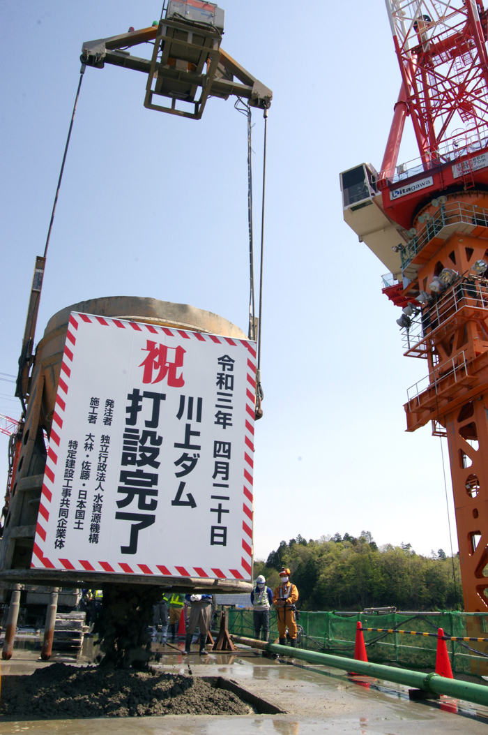 完了式には職員と施工業者計約60人が出席。約4・5立方メートルのコンクリートが入ったバケットをタワークレーンでつり上げ、堤頂部の最後の投入場所に流し込むと、関係者がいっせいに万歳三唱した。