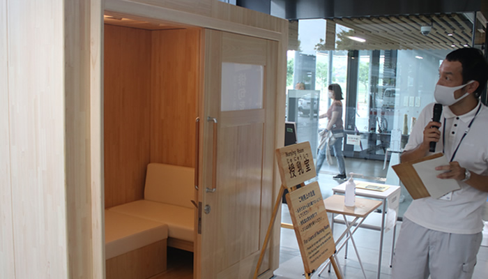 授乳室は9月24日まで、同市四十九町の市役所本庁1階の正面玄関脇に設置され、開庁時間帯なら誰でも利用が可能。その後は各保健センターなどで巡回展示し、市民に試用してもらうという。