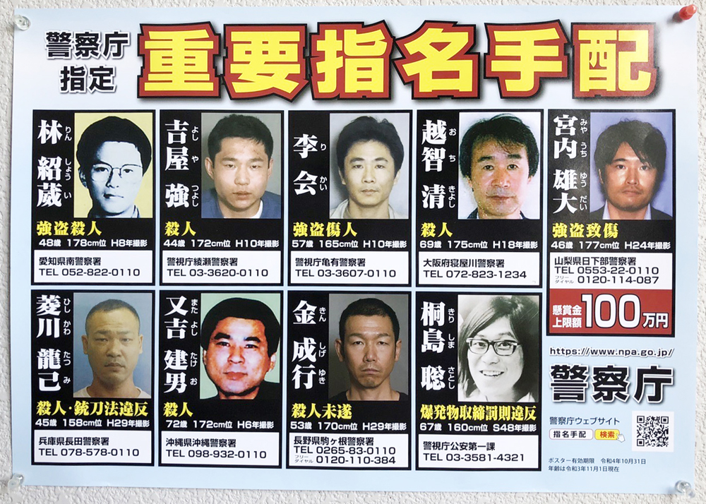 指名手配被疑者によく似た人を見掛けたといった通報など、どんなわずかなことでも結構ですので、警察に通報して頂くようお願いします。