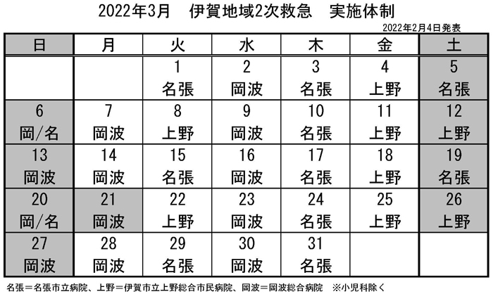 三重県の伊賀・名張両市は2月4日、伊賀市立上野総合市民と名張市立、民間の岡波総合(伊賀市上野桑町)の3病院による3月の時間外2次救急実施体制を発表した。
