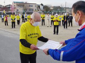 体操後、亀井市長は「地域住民の健康づくりや安否確認など、果たしてこられた役割は大きい。これからも地域の模範として続けて頂きたい」と述べ、小坂雄宏代表(85)に感謝状を手渡した。小坂代表は「まだ折り返し地点。20年、30年と、これからも続けていきたい」と話していた。