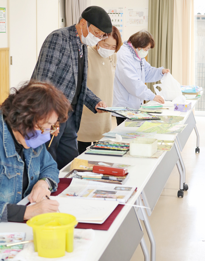 4年ほど前から参加しているという70代の夫婦は「絵を描き始めてからは出掛けると絵になりそうな景色を探してしまう。皆の作品を見て、地元の良さや頑張ってきた成果を少しでも感じてもらえたら」と話しながら、パレットを無数の色に染めていた。