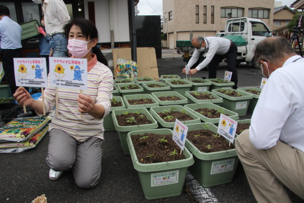 6月6日には、ポットに入った「ピノチオゴールド」という品種の苗を同市上野忍町の銀座中央駐車場に届け、集まった両団体の約20人がプランターに植え替える作業を行った。プランターには「ウクライナに平和を」というメッセージとともに上野南部地区の女子高生が作画したヒマワリと忍者のイラストが添えられている。
