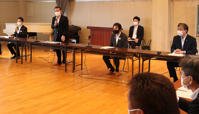 【会議の冒頭で発言する一見知事(左から2人目)ら=伊賀市三田で】