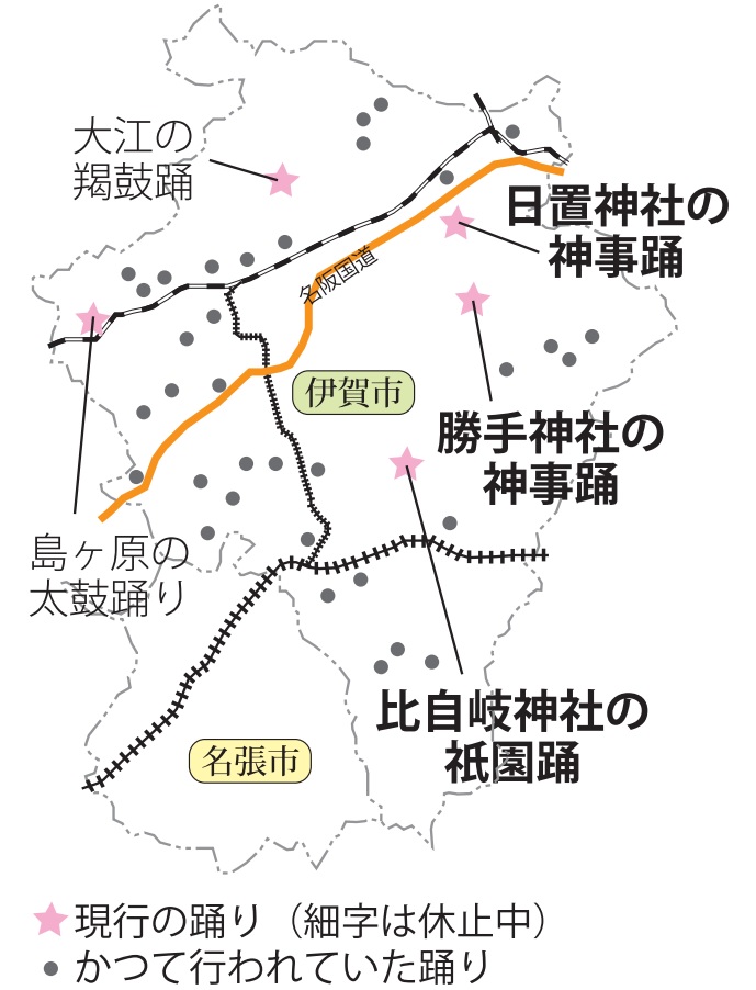 この他、都美恵神社(柘植町)では7月の祇園祭で「稚児踊り」、陽夫多神社(馬場)では8月の祇園祭で「願之山踊」が奉納されている。