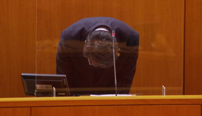 【議会で頭を下げる北川市長=名張市役所で】