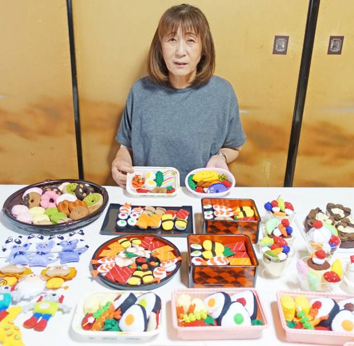 ままごと遊びにいかが―。三重県伊賀市依那具の米森郁子さん(64)は、フェルトで卵焼きやタコのウインナー、果物など、カラフルで温かみの伝わる立体的な小物を作り、箱やカップに詰めて弁当やデザートに仕立てるなど、孫や知人へプレゼントして喜ばれている。