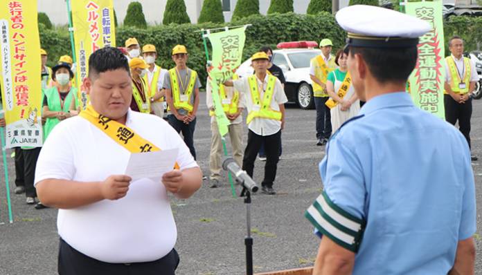 【今村署長(右)に向け交通安全宣言を読み上げる中島さん(左)=名張市夏見で】