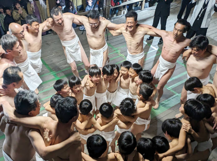 裸々押しは天正年間(1573-92年)に始まったとされ、2つの地区に分かれた氏子同士が押し合ってその年の収穫の具合などを占ったと伝わる。コロナ禍で2021年から3年連続で規模を縮小していたが、今年はスポーツ少年団の小学生らが戻り、例年の規模での開催となった。
