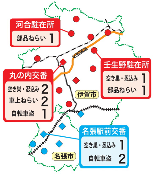 空き巣や忍込みなどの侵入盗は、伊賀署で3件(丸の内2、壬生野1)、名張署で1件(名張駅前)あり、自動車関連犯罪は、伊賀署で車上ねらい2件(丸の内)、部品ねらい2件(壬生野・河合各1)だった。