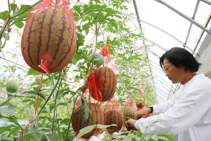 風農園は2020年、空中栽培を本格的に開始。地上1メートル以上の高さに据えたプランターを利用して水や養分を調節し、ネットに入れたスイカをつり下げて栽培している。