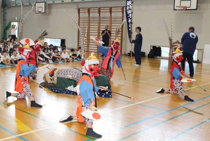 地域の伝統文化を学ぶ授業の一環。蔵持獅子神楽保存会のメンバーが舞の種類や使う道具などを説明した後、大人が演じる獅子が登場した。続いて児童が扮する5人の子ども天狗が登場し、寝ている獅子にちょっかいを出す様子など、息を合わせて演じた。