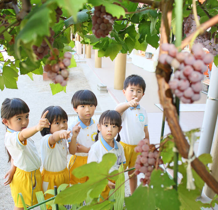 同園では、植物や野菜の栽培活動、食育活動が盛んで、ブドウの木はガーデニングが好きな保護者有志が植樹した。園児たちも水やりや草引きの作業体験に取り組んでいる。