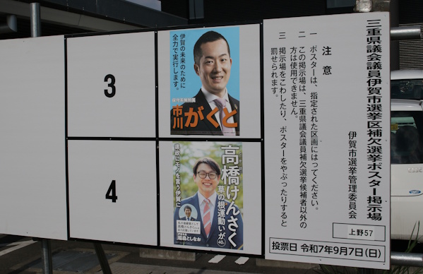 立候補したのは届け出順に、無所属で前伊賀市議の市川岳人氏(43)=自民、公明推薦=と、地域政党の草の根運動いが公認で元物流会社員の高橋健作氏(40)。