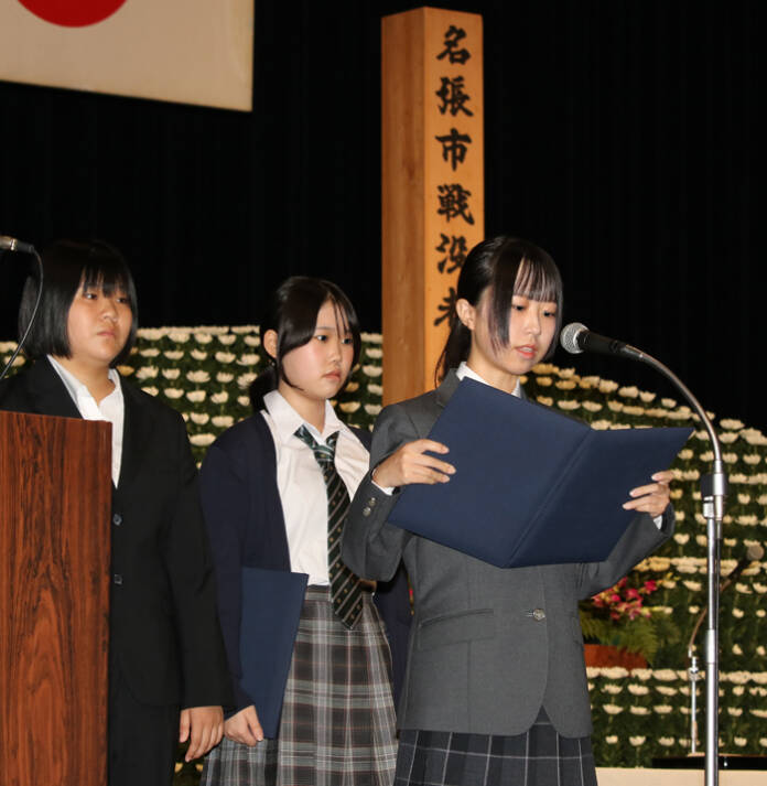 朗読に臨んだのは、私立英心高校桔梗が丘校2年の浦田円香さん(17)と吉岡花梨さん(16)、1年の杉本真菜さん(15)。3人は市遺族連合会が1991年に発刊した「追憶」から、海外の戦地で父を失った遺児の文章を読み上げ、静まり返った会場に一語一語を響かせた。