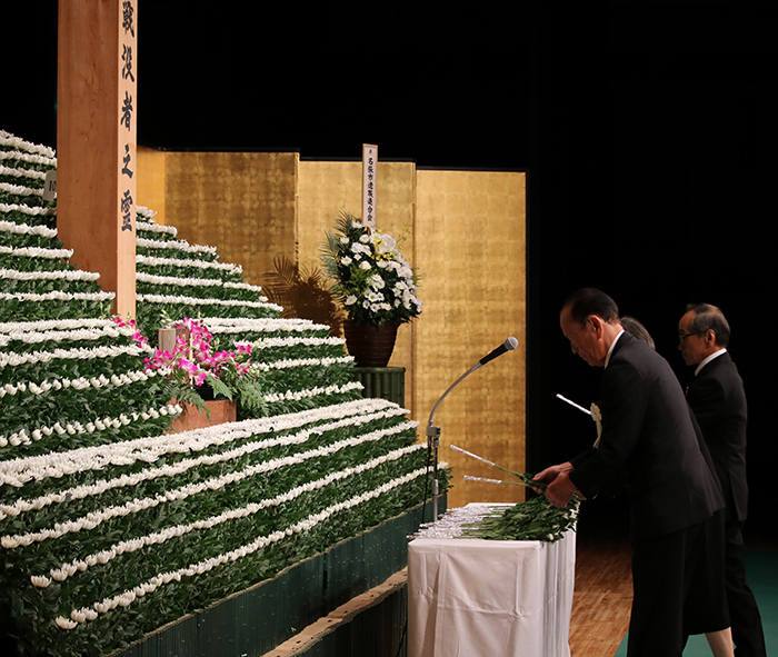 三重県名張市の戦没者追悼式が10月1日、同市松崎町のadsホールで営まれた。戦後80年の節目に、各地区の遺族会関係者ら約300人が参列し、祭壇に白菊を供えた。高校生による戦争遺児の文章の朗読もあった。
