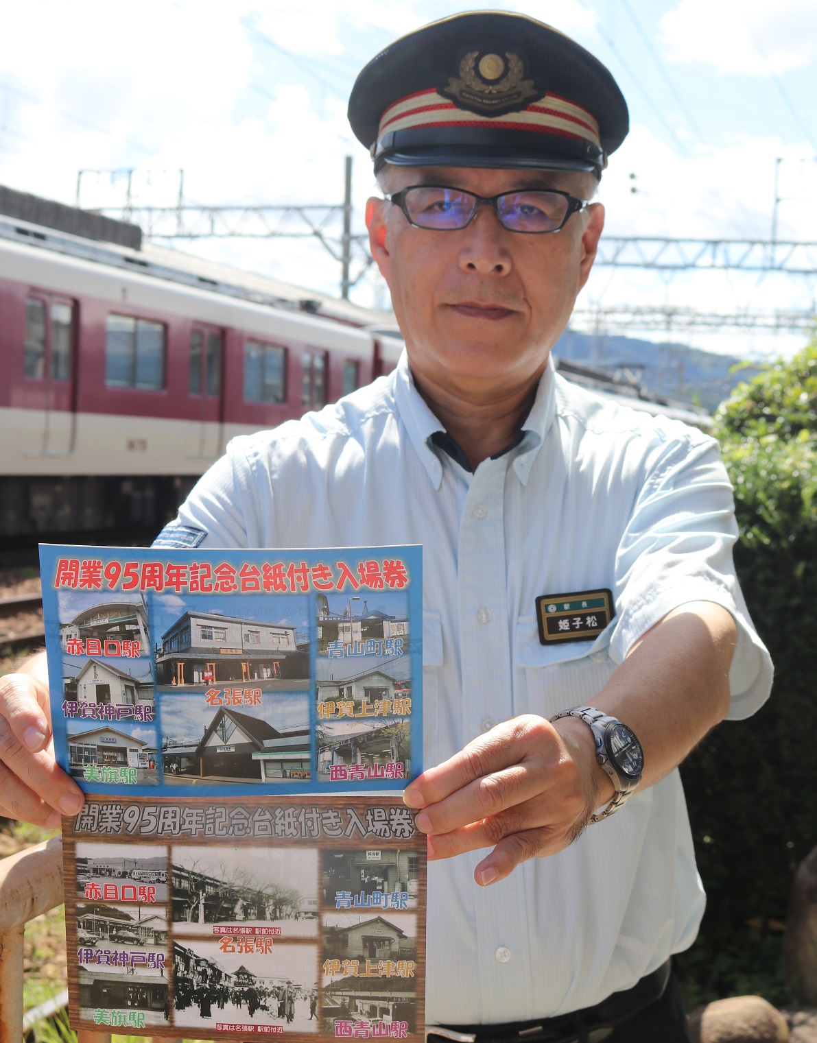 【記念入場券の台紙を手にする姫子松駅長=名張市平尾で】