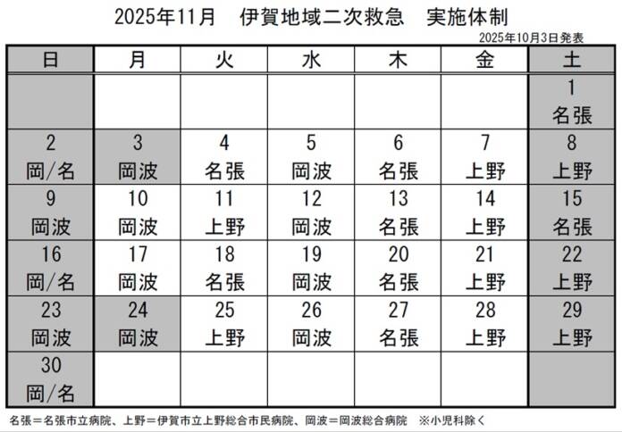 三重県の伊賀・名張両市は10月3日、伊賀市立上野総合市民と名張市立、岡波総合(伊賀市上之庄)の3病院による11月の時間外二次救急実施体制を発表した。