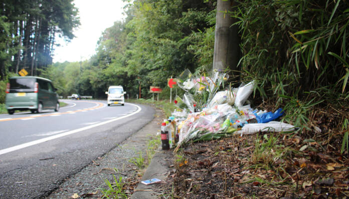 【事故現場付近に供えられた花や飲み物など=名張市上小波田で(10月6日午前8時37分撮影)】