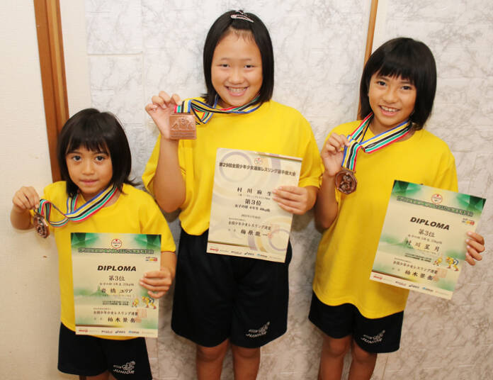3人は、5年生の村川麻生さん(10)、3年生で妹の星月さん(9)といとこの岩橋ユリアさん(8)で、いずれも同市桐ケ丘在住。姉妹は2年半前から、ユリアさんは1年半前からレスリングに挑んでいる。村川さん姉妹の挑戦は「強くなりたい」「筋肉をつけたい」との思いがきっかけで、2人の背中に憧れてユリアさんも続いた。