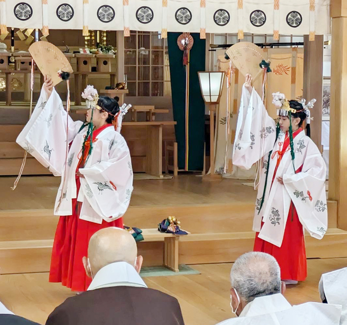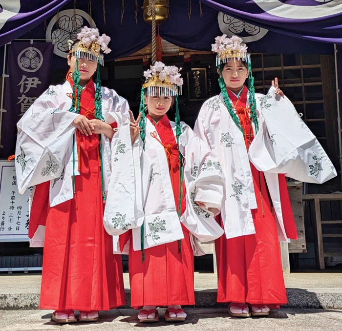 一方で、3人は伊賀東照宮の舞姫も務める。華やかな着物に花飾りをつけ、扇や鈴を手に約15分間舞う姿は、参拝者を魅了する。奉納は年4回で、次は10月17日の新穀感謝祭に臨む。