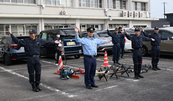 停電時の対応では、庁舎に電源を供給する非常用発電装置や、信号機に接続する小型のインバーター発電機の取り扱い訓練があり、交通課所属の署員を手本に手信号の動作を確認した。災害装備資機材の一つでエンジンカッターを使った訓練などにも取り組んだ。