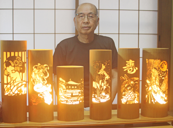 これまでの作品では、扇を持った舞妓や雪の積もった銀閣寺がお気に入りで、今後は元絵もオリジナルの竹あんどんを作りたいとのこと。島内さんは「じかに作品を見て、それらが作り出す癒やしの空間を体験してほしい。ぜひ竹あんどんの魅力に触れてもらい、興味を持つ人が増えてくれたらうれしい」と語った。