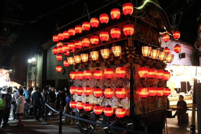 この日は午後6時ごろから、市中心部の銀座通り、本町通りなどの周辺にある9つの町の蔵付近でだんじりが展示され、一部の町では、だんじりに乗り込んだ囃方が鉦(かね)や横笛などで軽快にお囃子(はやし)を奏でていた。
