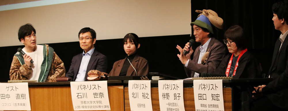 田中さんが参加したのは、北川裕之市長や環境省、文化庁の担当者らが参加した「保護と活用」がテーマのパネルディスカッション。北川市長からは、同市の日本サンショウウオセンターが赤目滝水族館にリニューアルしたことや、保護資金を確保するクラウドファンディングの返礼として交雑種の隔離プールの掃除があったことなどを紹介され、田中さんは「リニューアル後は行ってないので行きたい。プール掃除もしたい」と意欲的に話し、会場を沸かせた。