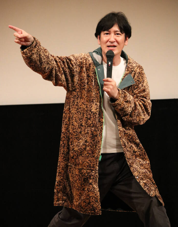 【オオサンショウウオ柄の防寒着を着て登場した「ココリコ」の田中さん=名張市松崎町で】