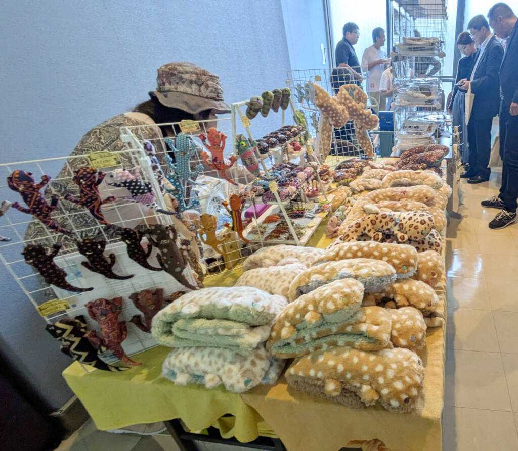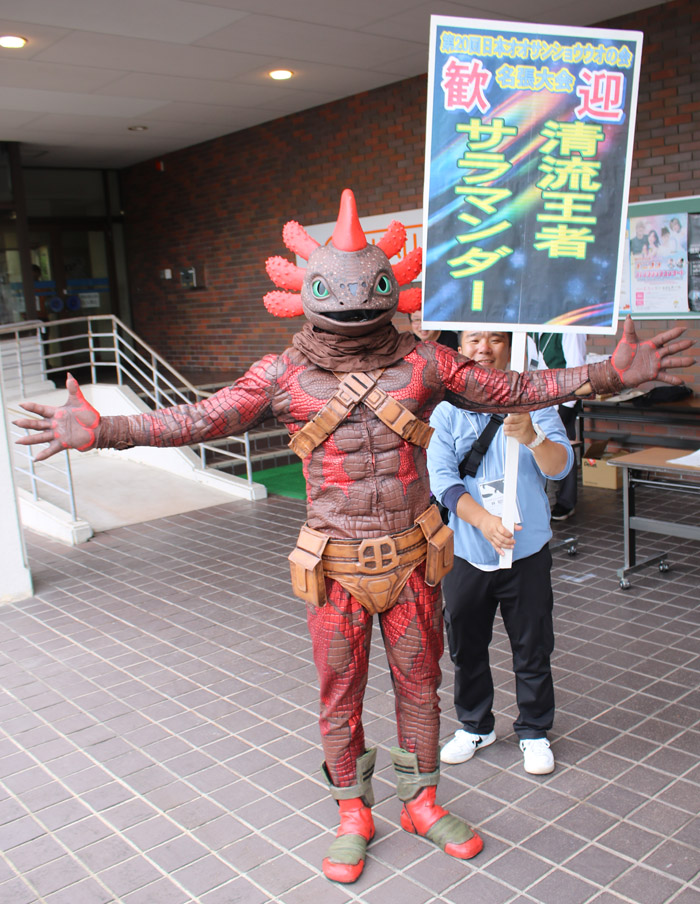 会場では、各地のオオサンショウウオグッズが販売された。山口県岩国市からは、オオサンショウウオをモチーフにしたご当地ヒーロー「清流王者サラマンダー」が駆け付け、注目を集めていた。