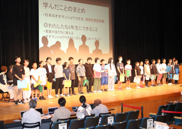 大会では5年生23人が登壇し、多くの来場者を前に交代しながら発表。「オオサンショウウオかるた」を使って遊びながら特徴や生態を学んだこと、夜間や日中の観察会に参加したこと、交雑種の隔離プールを見学したことなどを紹介した。
