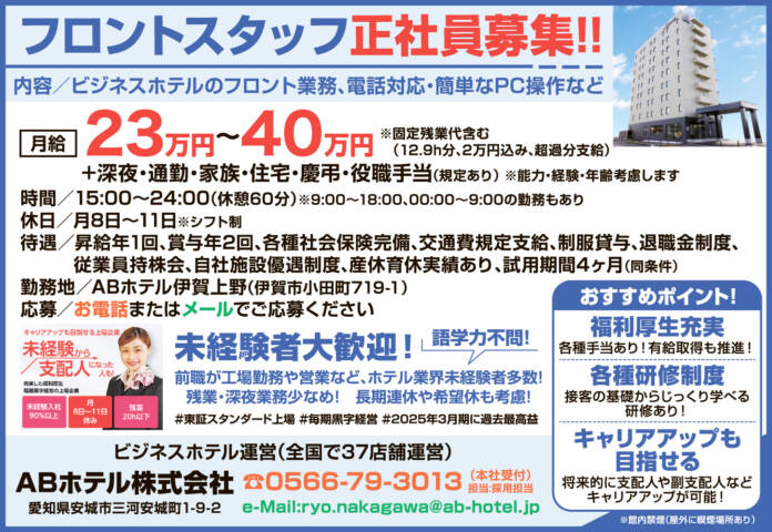 応募/お電話0566-79-3013(本社受付:採用担当)またはメール(ryo.nakagawa@ab-hotel.jp)にてご応募ください