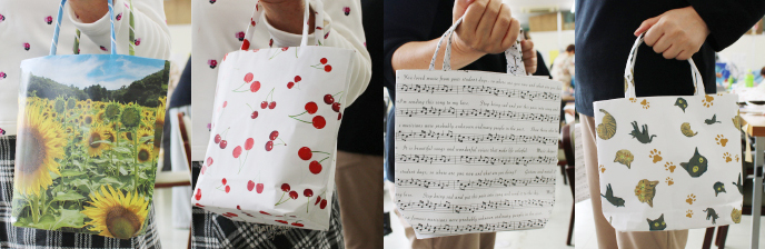 新聞紙のバッグにヒマワリの写真やサクランボのイラストをあしらった森志津さん(80)は「知らない人とも自然に会話ができて楽しかった。思っていた以上の出来に満足。次は友人も誘って参加したい」と話した。