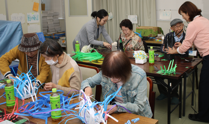 教室には、80代までの高齢者が参加。スタッフが読み上げる10個の単語を覚えたり、題から連想される言葉を書き出したりする「脳トレ」で記憶力や発想力を刺激した後、新聞紙とPPバンドを使ったバッグ作りに取り組んだ。