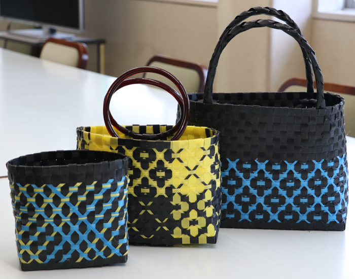 PPバンドの編みかごバッグでは、印刷工場から新聞紙やちらしを運ぶ際に使った結束用バンドを再利用。黒や白、黄、紫、青などさまざまな色があり、縦横に丁寧に編み込んで形を整えた。